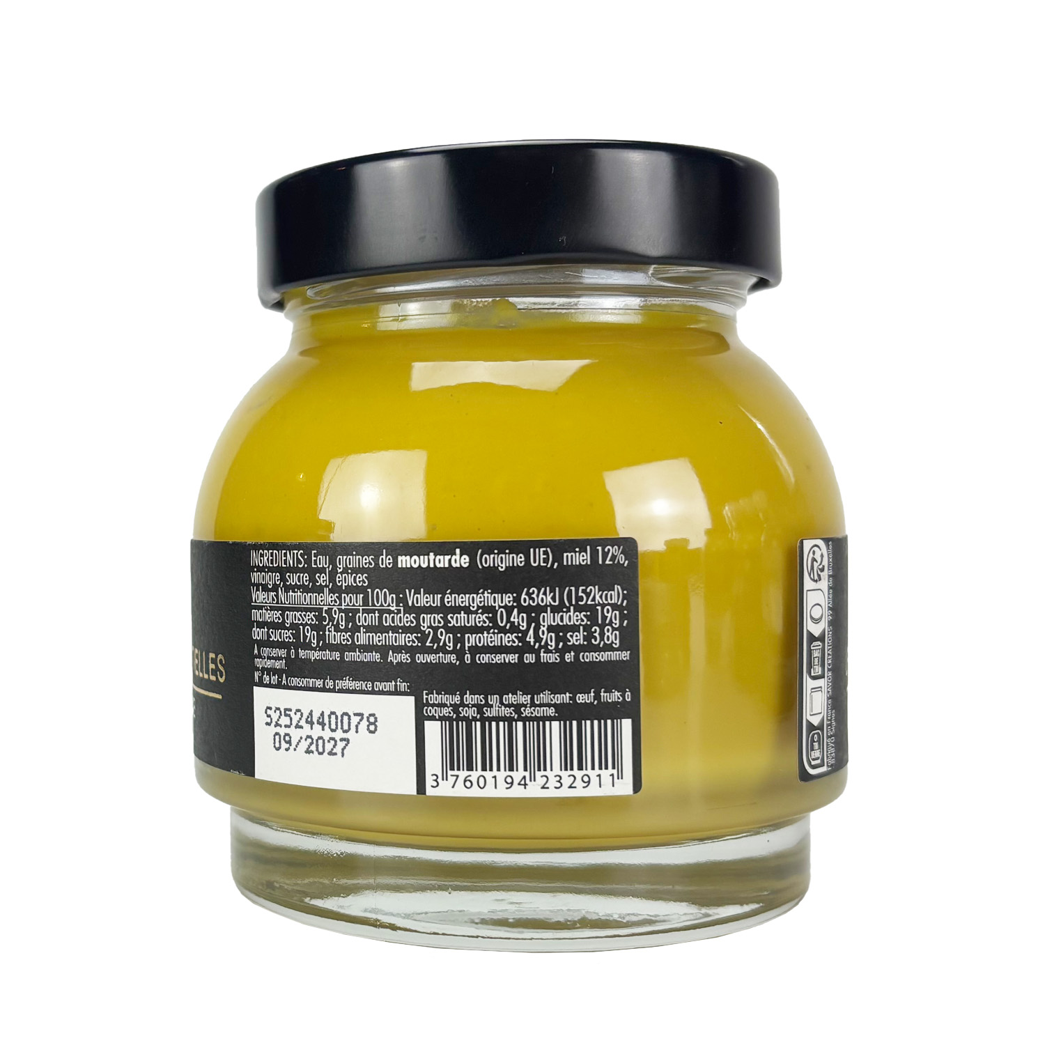 Eau, graines de moutarde (origine UE), miel 12%, vinaigre, sucre, sel, épices