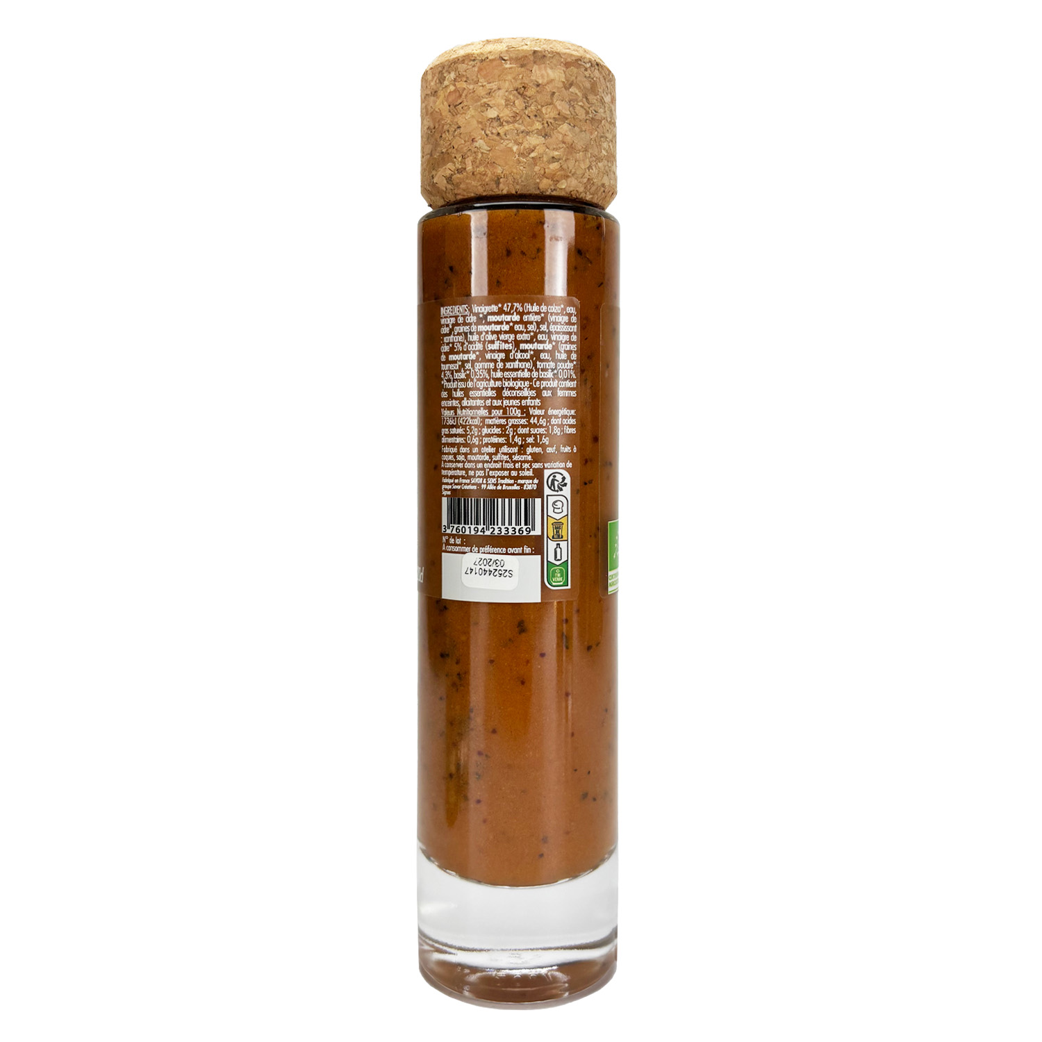 Vinaigrette* 47,7% (Huile de colza*, eau, vinaigre de cidre *, moutarde entière* (vinaigre de cidre*, graines de moutarde* eau, sel), sel, épaississant : xanthane), huile d'olive vierge extra*, eau, vinaigre de cidre* 5% d'acidité (sulfites), moutarde* (graines de moutarde*, vinaigre d'alcool*, eau, huile de tournesol*, sel, gomme de xanthane), tomate poudre* 4,3%, basilic* 0,35%, huile essentielle de basilic* 0,01%.